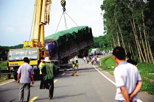 5月25日凌晨3时许,司机无证驾驶一辆车况已属“报废”的机动三轮车,载着22名荔枝厂临时包装工人,在223国道海口三门坡镇往大坡镇方向52.3公里处,与一辆占道行驶的货车相撞,造成三轮车上3人死亡(一男两女)、15人不同程度受伤。
