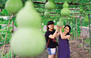 5月31日,文昌市东路镇葫芦村,游客们在农田里观赏葫芦,感受田园风光。