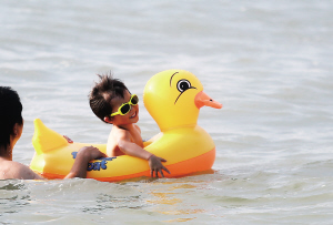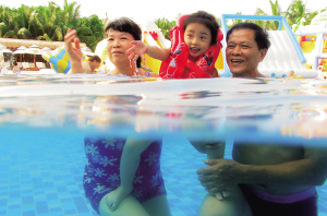 ①5月30日下午,在海口观澜湖国际旅游度假区火山岩主题水上乐园,家长们带着小朋友在水中戏耍。