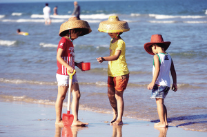 ②5月31日,东方市八所镇滨海北路,小朋友在海滩上嬉戏。