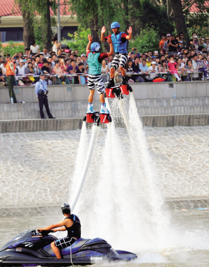 当日,哈尔滨市端午节水上活动在哈尔滨防洪纪念塔下的松花江段举行。水上飞人运动员表演了蛟龙出水、正向钻水、背向钻水、转体360度钻水、有轴转体、无轴转体、后空翻等特技动作,吸引了众多市民前来观赏。