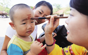 6月2日,三亚南山景区工作人员为小朋友点雄黄。
