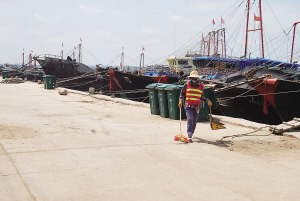 新英码头约1000余米长,停靠着100多艘渔船。正午的太阳正火辣辣,虽然路面看不到明显垃圾,但记者看到,路面上仍有两个戴帽子蒙口罩的清洁工在忙碌着。