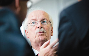 6月4日,德国联邦总检察长哈拉尔德·朗格(中)在首都柏林德国联邦议院法律事务委员会与人交谈。德国《南德意志报》3日报道,朗格当天决定对美国情报机构监听德国总理默克尔手机一事启动刑事调查。
