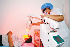 2、红蓝光照射:红蓝光照射是一种无痛、非侵害性的治疗方法。其原理是利用红光消除炎症造成的红肿,刺激使纤维细胞增生,促进胶原蛋白的形成和皮损自愈。蓝光则可作用于痤疮丙酸杆菌所产生的内源性卟啉,产生大量单态氧,从而起到杀菌的作用。利用红蓝光交替照射病损部位,对痤疮炎症损害有很好的消退作用,可进一步提高中重度痤疮的治愈率。