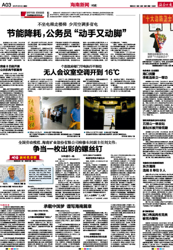 本报海口6月5日讯(记者单憬岗)“绿色节能我们林业系统最支持了,厅里已经要求各部门、各单位厉行节约用电,坚决杜绝各类浪费能源的行为。”今天,办公室位于省林业厅办公楼6楼的公务员麦匡耀一边上楼梯一边说,其实林业系统的人因为经常要上山穿林子,平时就养成了低楼层走楼梯的习惯,减少电梯使用。不仅习惯于经常“动脚”,他们还经常“动手”,通过多部门合用打印机、充分利用自然光照明、减少空调使用等多种方式进行节能。