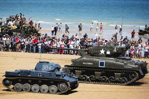 乌伊斯特勒昂艳阳高照,在70年前英国军队登陆诺曼底的主要地点宝剑海滩,主办方搭建起巨大看台接待各国嘉宾,并竖起巨大屏幕,放映反映第二次世界大战历史的纪录片。20国国家元首和政府首脑与1800多名参加诺曼底战役的老兵在现场重温那段历史。