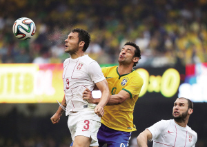 巴西队球员弗雷德(中)在比赛中与对手争顶。
