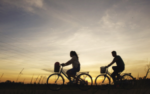 6月4日,两位市民在夕阳中骑行。高温时节,琼海市的人们三三两两在田野公园边骑行观光边健身娱乐,享受夏日傍晚时分的凉爽和惬意。