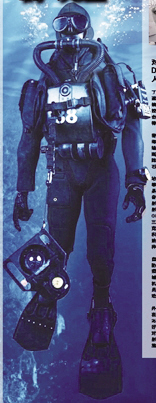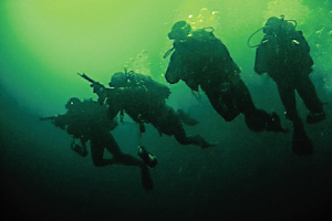 在完全黑暗的条件下,士兵由特殊器材引导深潜。由于深水中强劲的潮涌,这是一项很容易耗尽体能的任务。