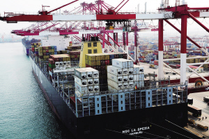6月8日,货轮在山东青岛港外贸集装箱码头装卸集装箱。