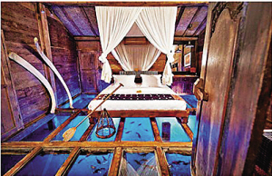 据悉,这种“鲜虾套房”是充满爪哇特色的独立小木屋,屋内铺上了透明玻璃地板,房客可在房内随时欣赏下面的游鱼活虾,犹如置身海上,可充分感受原野生活。