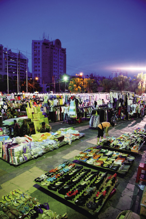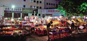 海南的夜市在夏天尤其热闹,白天炙烤得无精打采的人们,天一黑就精神起来,小贩们推着改装的三轮车从各个地方冒出来,将一捆一捆的衣服,一箱一箱的杂货,自成章法、杂而有序地摆放在约定的地盘上。