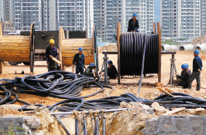 6月10日,三亚市凤凰路,海南电网公司三亚供电局工程人员,正在安装10千伏出线电缆。据了解,为加快三亚电网改造,缓解部分片区的供电紧张状况,今年2月三亚修建了凤凰水城等变电站,预计今年7月完工供电。