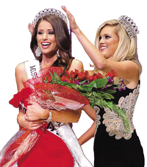 2014年度美国小姐选美大赛美国当地时间8日晚落下帷幕,24岁女孩妮雅·桑切斯(左)最终斩获桂冠,荣获第63届美国小姐称号,并将代表美国参加今年的世界小姐大赛。图为颁奖仪式上,2013年度的美国小姐得主艾琳·布莱迪(右)亲自为桑切斯加冕。