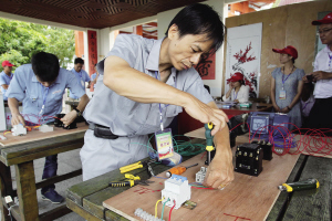 6月11日,三亚市国资系统2014年“鹿回头·敬业杯”劳动技能竞赛,在鹿回头景区举行。国资委系统属下的鹿回头景区、天涯海角、大小洞天等单位岗位能手,参加了景观车驾驶、景点讲解、维修电工等项目的比拼。图为参赛选手在进行维修电工项目的比赛。本报记者 武威 摄
