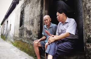 6月11日,海南省文昌市东阁镇鳌头村村民邢锋(右)在幸存者杨应庄老人家中搜集屠杀惨案证据。