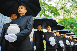 9时10分许,司号者吹奏起安魂曲,身着黑色中山装的护灵者手捧骨灰罐,在手执黑伞的另一位护灵者护卫下,缓步走到中国远征军抗日阵亡将士纪念碑前,随后将骨灰罐安放在墓地的地宫中。