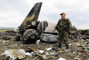 乌克兰国防部网站14日发布消息说,一架伊尔-76军用运输机当天凌晨在卢甘斯克机场降落时被反政府武装用防空武器和大口径机枪击落,机上载有执行轮换任务的军人、武器装备和食品。乌克兰国防部、总参谋部和空军司令部向遇难军人的父母和亲友表示真诚的慰问。