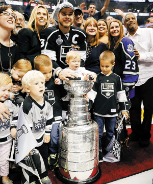 洛杉矶国王队14日以3:2击败纽约巡游者队,夺得本赛季北美职业冰球联赛(NHL)冠军,这是国王队最近三年第二次问鼎斯坦利杯。图为国王队球员和家属庆祝夺冠。新华社发