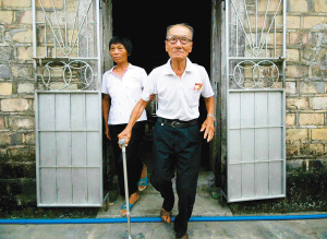 6月12日下午3时,走进文昌市潭牛镇二公堆村老人陈立轩家中。坐在轮椅上的老人起身相迎,右脚趔趄,步速却很快。一旁照顾的女儿解释:“爸爸的右腿打仗时,被日军枪弹打穿,跛了,行走不便。现在年纪大了,右腿更不好使,平时全靠轮椅出行。”