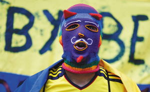 上图:一名哥伦比亚队球迷等待哥伦比亚队对阵希腊队的比赛。