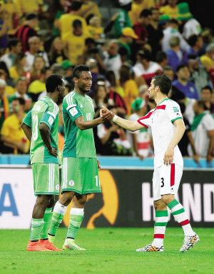 伊朗与尼日利亚的比赛是巴西世界杯开赛后第一场平局,同时这场0:0的闷战也被视为开赛后最无聊的比赛。图为两队队员赛后握手。新华社发