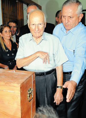 这是2010年9月12日在土耳其安卡拉拍摄的土耳其前总统凯南·埃夫伦(中)参加修宪议案公投的资料照片。 新华社发