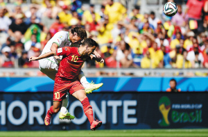 世界杯首秀,阿扎尔的最大亮点显然是第79分钟那次颇显功力的助攻。当时队友德布鲁因中场抢断后,阿扎尔迅速拿球组织疾风般的快速反击,面对一路退守的阿尔及利亚后卫线,他在中路从容推进后,适时将球传给右路插上的默滕斯,由后者一蹴而就,“红魔”如愿逆转。虽然本场最佳球员称号被颁给了队友德布鲁因,但阿扎尔的作用绝对不可忽视。