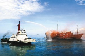 本报三亚6月18日电 (记者张靖超 通讯员刘义 张新)“海通火情,请立即救援……”今天上午,三亚市海域上,一声急促的警报声拉开了救援的序幕,该市历史上最大规模的一次海上消防演习正式开始。