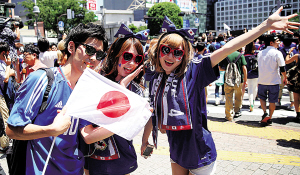 日本队与科特迪瓦队赛后,日本球迷们拿着与日本队服同样颜色的蓝色垃圾袋,沿着其他球迷离开后空旷的看台认真把垃圾拾起并带走。