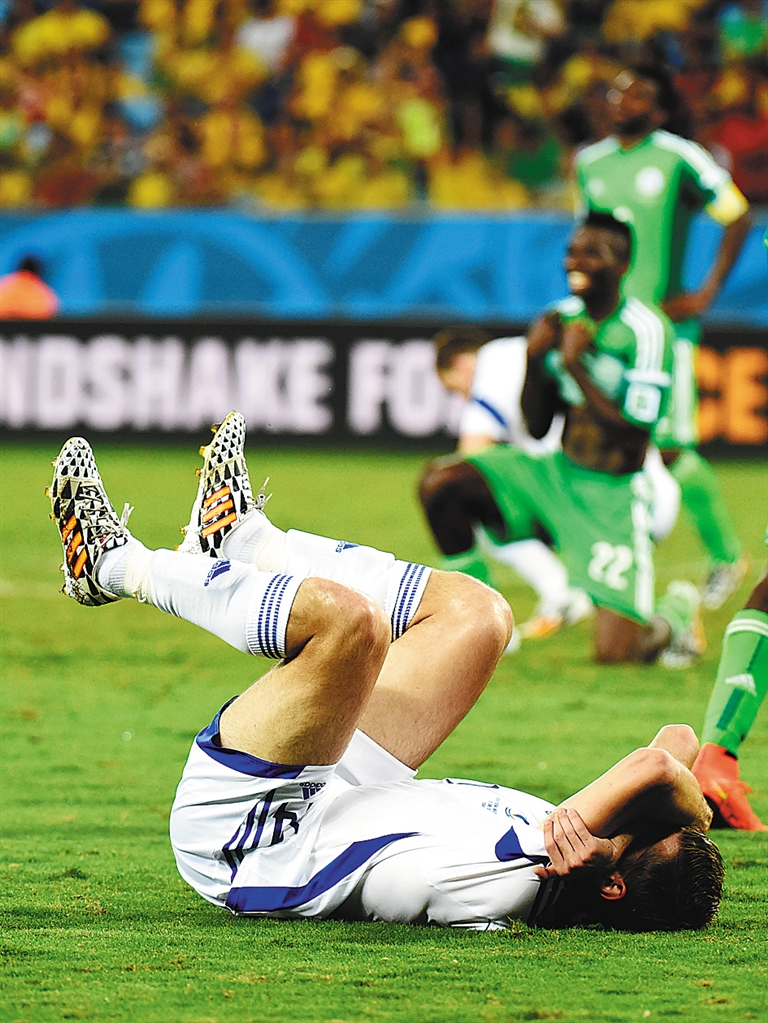 北京时间6月22日,波黑队0:1不敌尼日利亚,被淘汰出局。裁判对波黑队的两次不利判罚引起争议,被认为直接导致了波黑的失利。图为波黑队球员(前)比赛后倒在地上情绪低落。新华社发