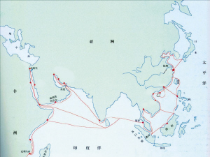 在古代,海上丝绸之路有3条主航线,一条是东海黄海航线,从登州、莱州、扬州、明州、泉州、漳州等地出发经东海或黄海至朝鲜半岛、日本或者东南亚;第二条是南海航线,从广州、徐闻、合浦出发经南海,穿过马六甲海峡进入印度洋,再西行至阿拉伯半岛、红海、波斯湾、地中海、欧洲及非洲东部;第三条是从广州、泉州、漳州出发经菲律宾进入太平洋,东行至美洲。其中,第二条南海航线最为重要,海南岛就位于这条航线的交通要道上。这条南海航线的形成在东汉班固《汉书·地理志》中已有记载。