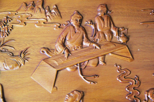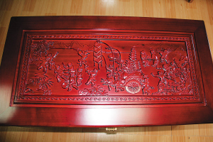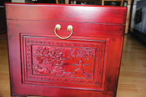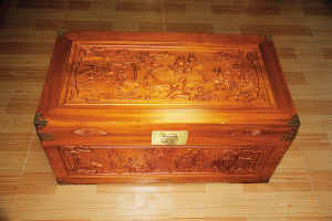 重新来到海南的樟木箱,产自浙江东阳。在一只只普通的樟木箱子上,精雕细镂了诸如“百子图”、“山水图”、“琴棋书画图”、“龙凤双喜图”、“八仙过海图”等等中国文化元素,使得它们有了身价百倍的理由。
