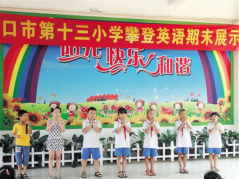 近日,海口市第十三小学举行攀登英语期末展示活动,近200多名学生和家长参加。这些小学一二年级的学生们用英语进行日常对话、演唱外国童谣、讲小故事,孩子流利的英语让家长们拍手称赞。“这些孩子学英语的时间其实并不长,最长的还不到两年。”十三小校长许伟绩说。