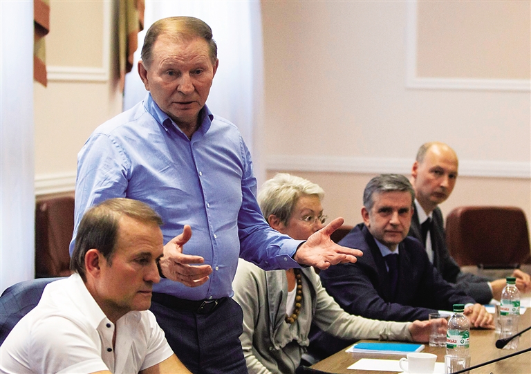 6月23日,乌克兰前总统库奇马(左二)在乌东部城市顿涅茨克州政府大楼举行的多边谈判上发言。 据乌克兰媒体报道,当日在顿涅茨克州政府大楼举行了有欧洲安全与合作组织(欧安组织)秘书长特使塔利亚维尼、乌克兰第二任总统库奇马、俄罗斯驻乌克兰大使祖拉博夫、“顿涅茨克人民共和国”和“卢甘斯克人民共和国”代表等方面人士参加的多边谈判,两个“共和国”的代表同意在27日前休战。欧安组织和俄罗斯将负责监督停火。