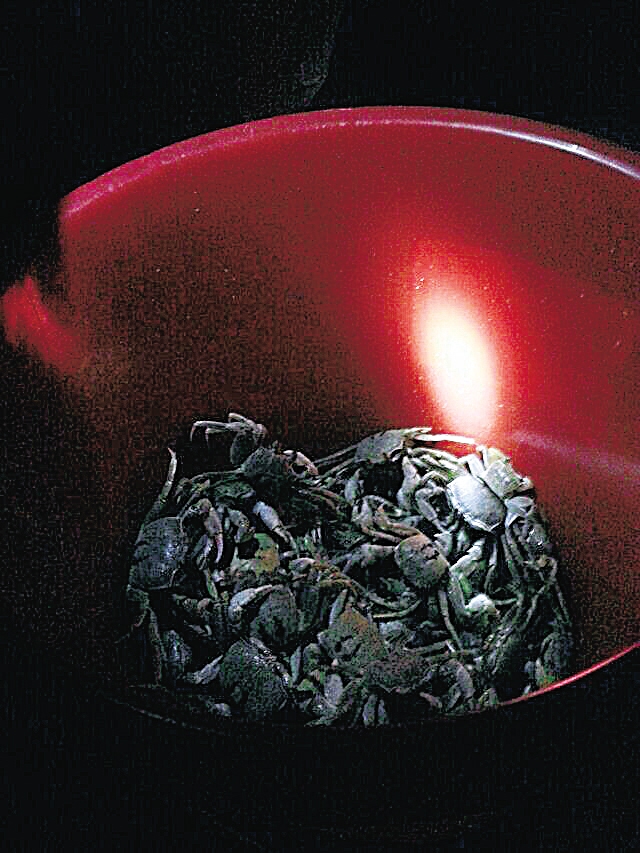 面对水桶内的战利品,往往只是不足一指长的小不点,若要品其美味,自然不能像往常的蒸煮,拿去煎炒,亦或熬成蟹粥,才能体现嫩蟹的鲜香。