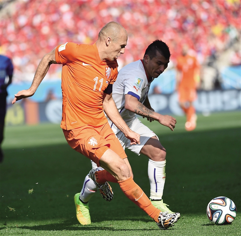 是役进攻线队友范佩西停赛,罗本当仁不让接过队长袖标,冲锋在前,引领全队剑指小组头名。事实上,这场同智利的比赛,“小飞侠”可以说是橙衣军团唯一的一把锋利尖刀:范加尔祭出4后卫外加3后腰的保守阵型,只留斯内德等人在前场寻找机会伺机反击,前锋出身的库伊特在大部分时间里在左路大幅后撤甚至化身第5名后卫。