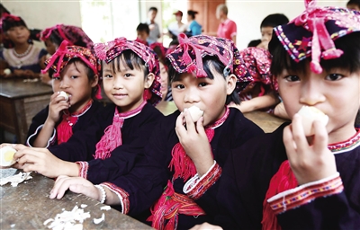6月24日上午,琼海市石壁镇南通小学的苗族学生在享用免费鸡蛋,中国社会福利基金会免费午餐基金管理委员会选择将海南省第一个“免费午餐”项目落户在此。南通小学将从7月1日起正式为学生供应免费午餐。该项目将陆续走进更多海南乡村小学。