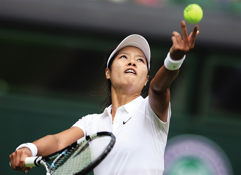 6月23日,在2014温布尔登网球公开赛女单首轮比赛中,中国选手李娜以2:0战胜波兰选手卡尼亚,晋级下一轮。图为李娜在比赛中发球。