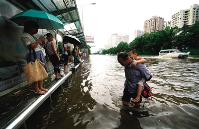 上图:中国城公交车站被水淹,乘客们在水中候车。