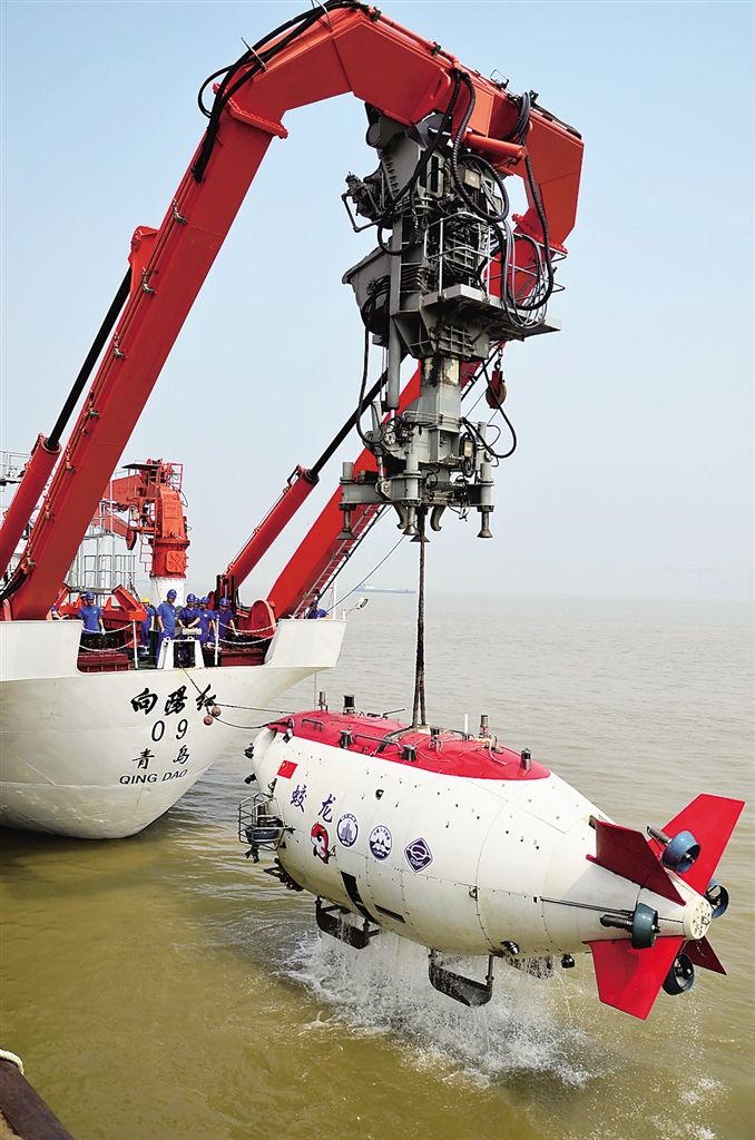 6月24日,“蛟龙”号载人潜水器在江苏省江阴市苏南国际码头进行长江试水演练,为出航做准备。据介绍,6月25日,“向阳红09”船将搭载“蛟龙”号正式起航,前往西北太平洋执行2014-2015年“蛟龙”号载人潜水器试验性应用航次。 新华社发