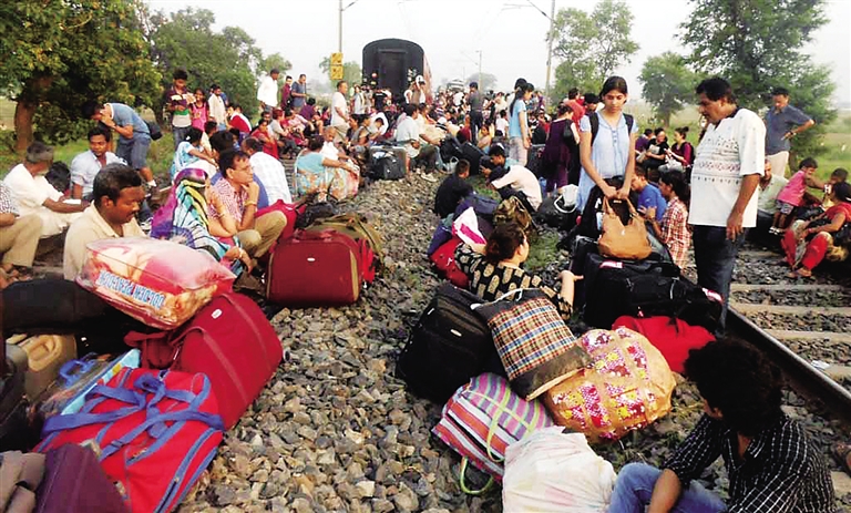 6月25日,在印度比哈尔邦的恰普拉地区,列车出轨事故发生后,乘客坐在铁轨上。 印度铁路部门官员25日说,当日凌晨一列从新德里驶往印度东北部的特快列车在途经比哈尔邦时发生出轨事故,造成至少4人死亡、8人受伤。 新华社发