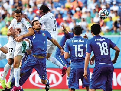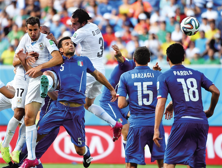 6月25日,在巴西纳塔尔沙丘竞技场进行的巴西世界杯小组赛D组比赛中,乌拉圭队以1:0战胜意大利队,以小组第二晋级十六强。图为乌拉圭队后卫迭·戈丁(中)头球破门得分,为球队打入致胜球。 新华社发