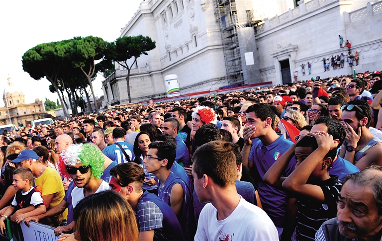 ➡在意大利罗马威尼斯广场,球迷在意大利输掉比赛后露出失望神情。