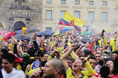 ⬆哥伦比亚队球迷在首都波哥大街头庆祝球队全胜晋级。
