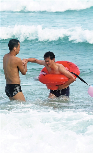 获救的这名男子王先生是来自上海的游客,同行的孟先生也是下海游泳后体力不支,被救生员救上岸的。
