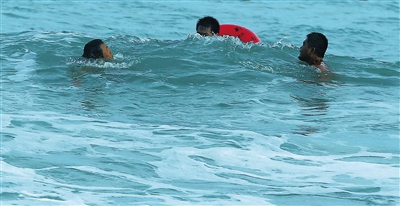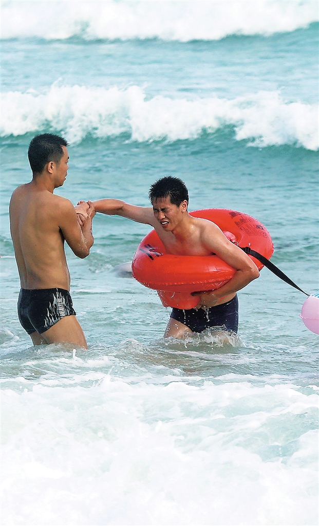 经过10多分钟,两名救生员将游客救上岸。被救的游客体力不支难于站稳,黝黑硕壮的救生员也累得气喘吁吁。