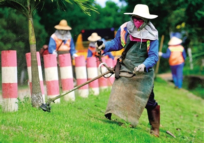 6月25日下午,海口市云龙镇云龙道班的工人们趁着天气好,抓紧时间割草护路。时下,正是海南的雨季,多雨的天气给海南各地的养路工人带来了不少的麻烦。据云龙道班班长陈之卫介绍,近期由于经常下雨,路面频繁受损,路边的杂草也长得很快,他们不得不加大工作量修路养路,以保证公路的畅通无阻。