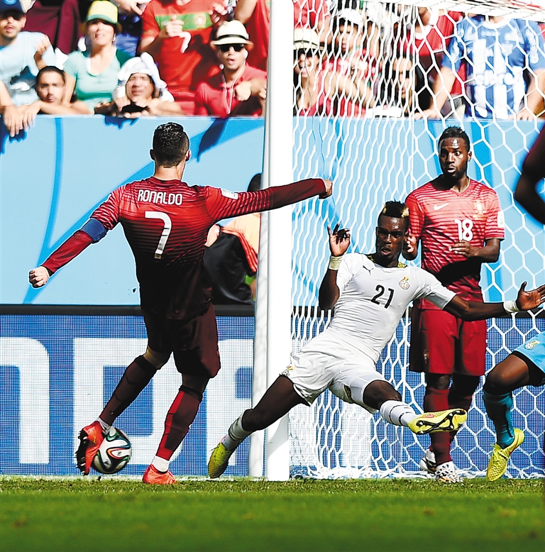 6月27日虽然葡萄牙队以2:1战胜加纳队,但还是因净胜球劣势被淘汰出局。C罗打入他在本届世界杯的唯一一粒进球。图为C罗射门得分。新华社发